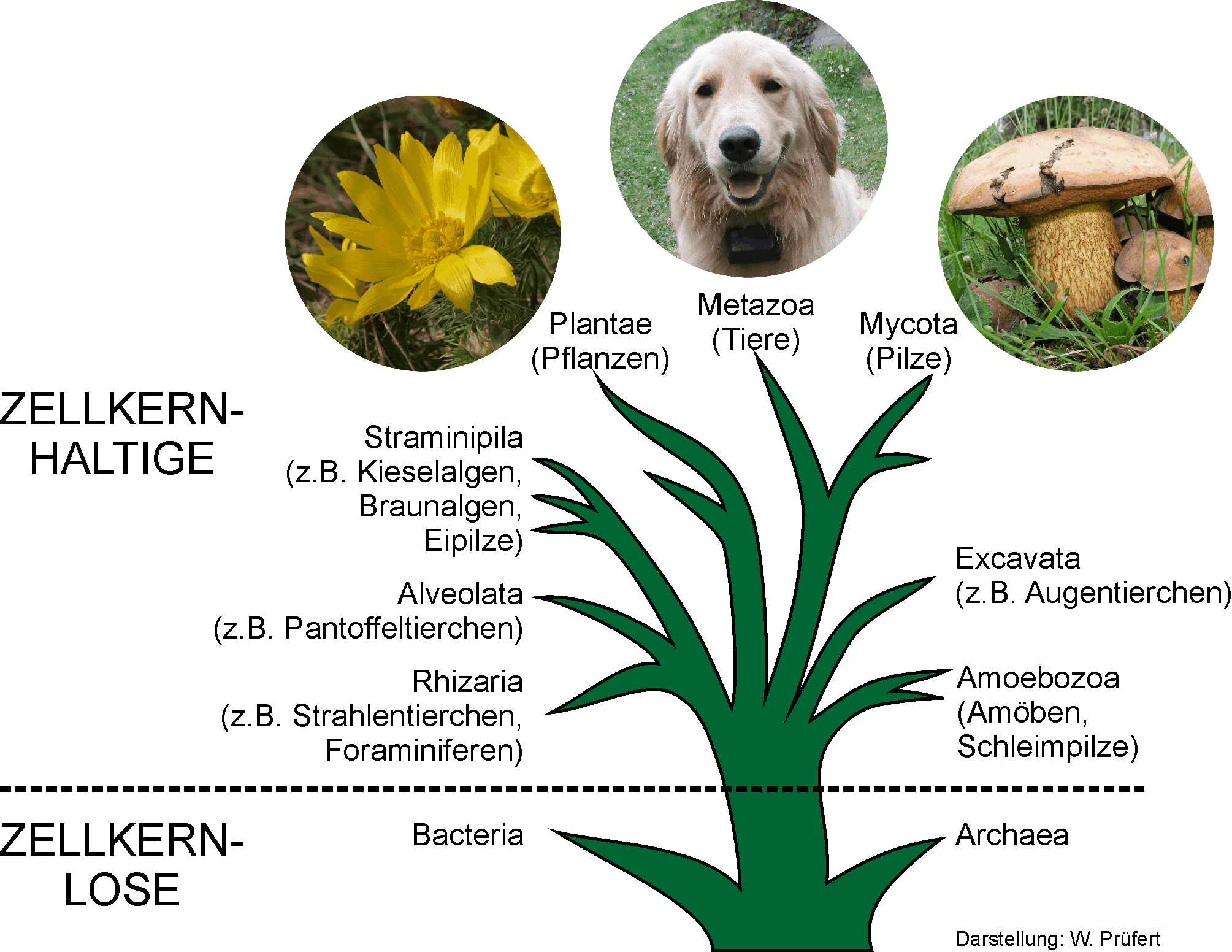 Die Zellen von Pilzen haben einen Zellkern, was sie mit Tieren, Pflanzen und Einzellern zu den „Eukarionten“ vereint und von den Bakterien und Archaeen trennt.