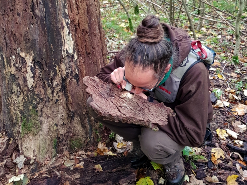 Rindenpilzsuche mit Hilfe einer LED-Einschlaglupe