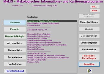 Als Kartierungswerkzeug für unsere Datenbanken und Offline-Erfassung wird aktuell das Programm „MykIS“ verwendet, das auf dem Datenbankmanagementsystem „Microsoft Access“ basiert. Die Anwendung funktioniert auch mit der kostenlosen Laufzeitumgebung (Runtime), sodass kein Kauf von Microsoft Access oder gar Microsoft Office erforderlich ist. Bitte beachten Sie, dass MykIS ausschließlich mit der 32-Bit-Version läuft. Den Funktionsumfang können Sie dem beigefügten „MykIS Anwenderhandbuch“ (siehe Kasten „Dokumente“) entnehmen.