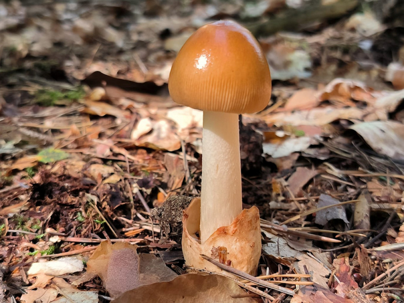 Durch den tieferen Blickwinkel und den richtigen Fokus ist der ganze Fruchtkörper gut erkennbar: Amanita fulva, der Rotbraune Scheidenstreifling.