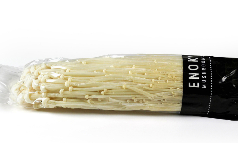 Enoki, eine langstielig gezüchtete Form des Samtfußrüblings (Flammulina velutipes agg.)