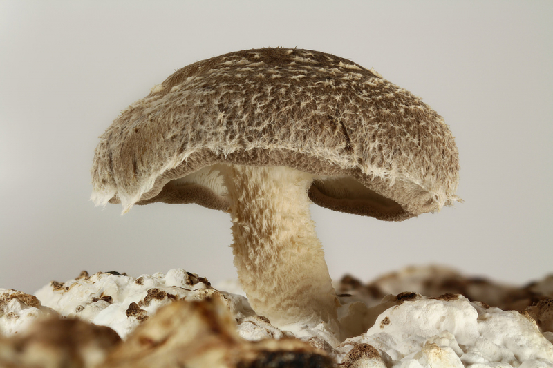 Ein aufgeschirmter Shiitake aus der Nähe.