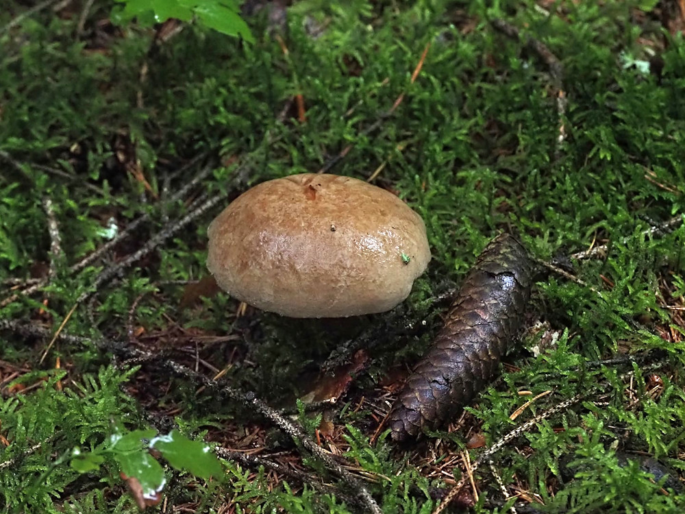 Zur Bestimmung oder Arteingrenzung wenig brauchbar: brauner Pilzhut auf moosigem Waldboden