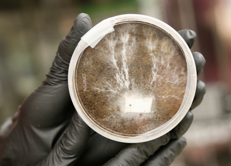 Petrischale mit Myzel, das in simulierter Marserde wächst, auch bekannt als Mars-Regolith