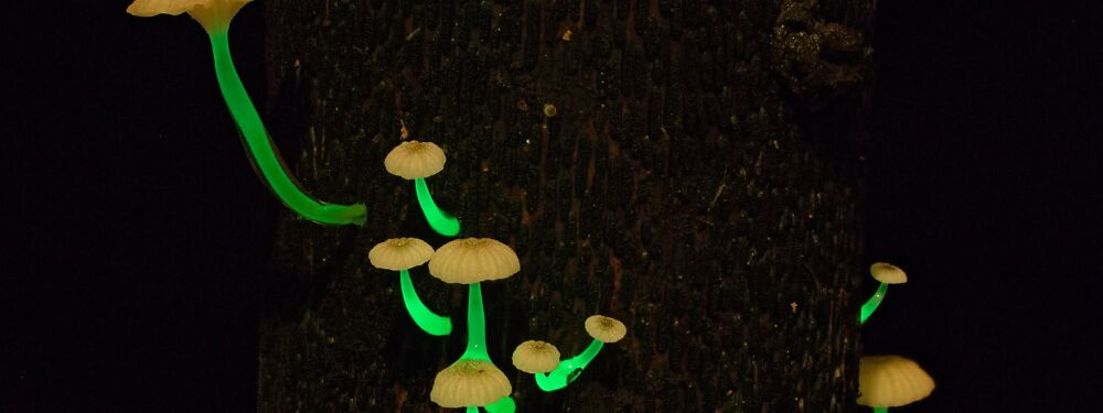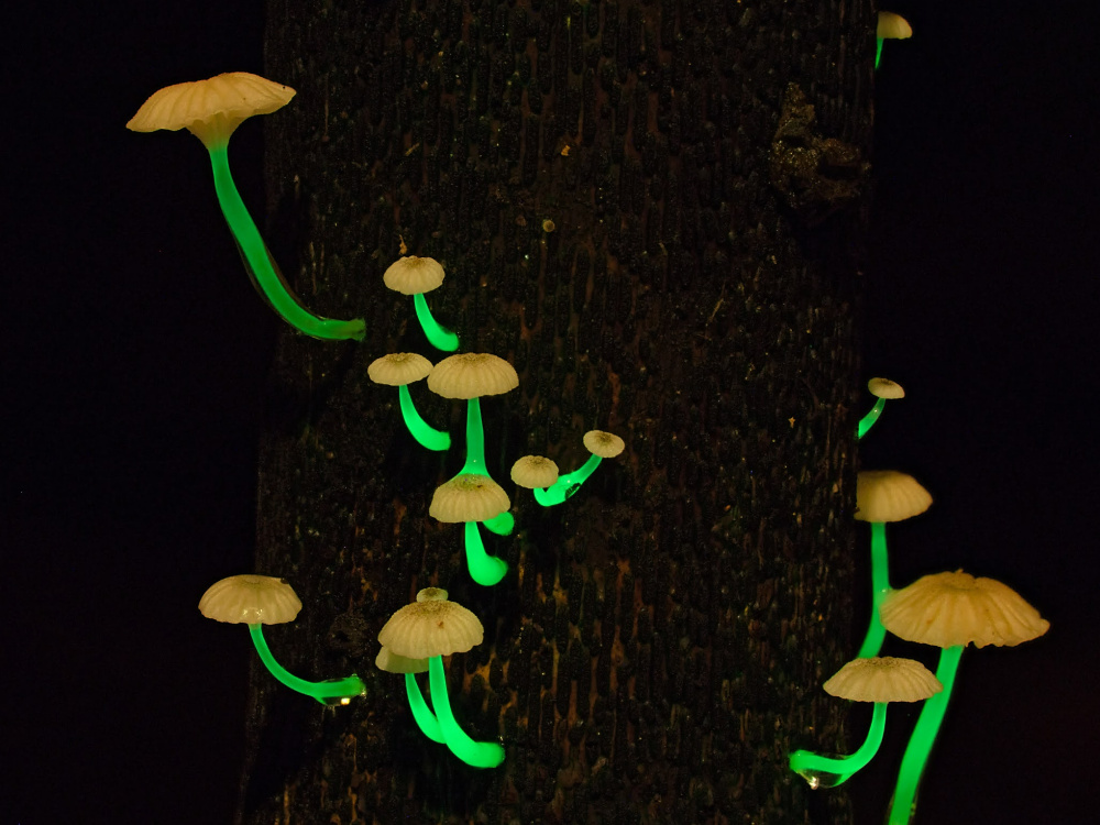 Wissenschaftler fanden 2020 im indischen Bundesstaat Meghalaya gleich mehrere unbekannte Pilzarten. Im Fall von Roridomyces phyllostachydis beeindruckt vor allem eine Besonderheit: Das Pilzgeflecht und die Stiele der filigranen Fruchtkörper leuchten im Dunkeln grünlich. Bei Tageslicht erscheinen die nur wenige Zentimeter großen Hutpilze dagegen unauffällig hellbraun bis schmutzigweiß.