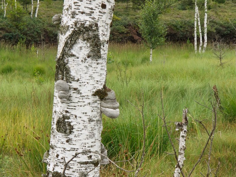 Kleine Exemplare des Zunderschwamms an einer schmalstämmigen Moorbirke