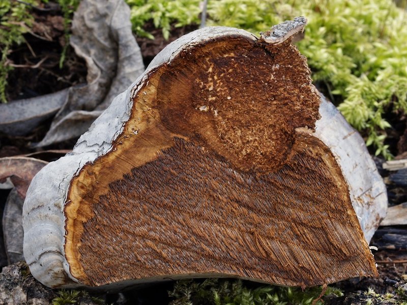 Aufgeschnittener Fruchtkörper eines Zunderschwamms: oben der Myzelialkern, links die Trama und unten die Röhrenschichten