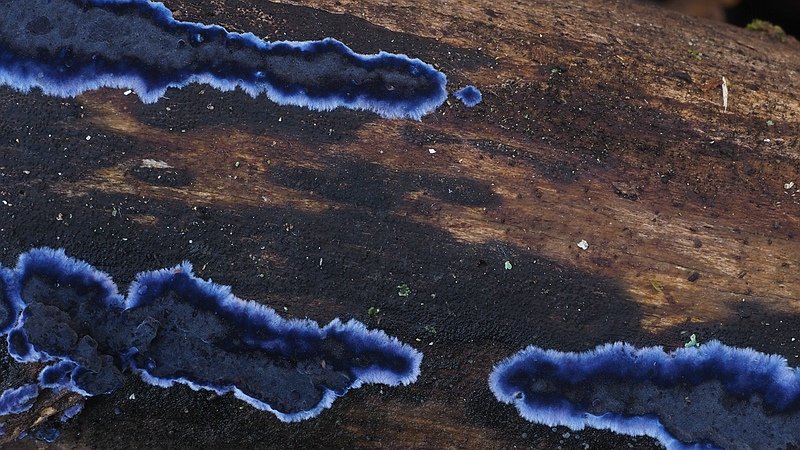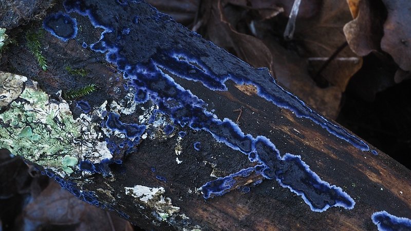 Die Fruchtkörper des Blauen Rindenpilzes bilden zunächst kleinflächige Überzüge auf dem Holz. Es wurden jedoch auch schon Fruchtkörper mit bis zu einem Meter Länge gefunden. Die Fruchtkörperoberfläche ist uneben, die Farbe violettblau bis fast dunkelblau bei älteren Exemplaren. Der dafür verantwortliche Farbstoff kommt aus der Gruppe der sog. Terphenyle, Moleküle mit drei Kohlenstoffringen, die in anderen Abwandlungen, z. B. als Polyporsäure, in vielen Porlingen vorhanden sind. Interessanterweise wachsen seine Pilzfäden in Reinkultur, also in Petrischalen mit Nährmedium, mit der gleichen Farbintensität wie beim Fruchtkörper. Die Eigenschaft, auf künstlichem Nährmedium zu wachsen, besitzen alle Pilze mit saprotropher Lebensweise, denn sie leben ausschließlich von toter organischer Substanz. Will man solche Saprobionten kultivieren, genügt es, ein Stück des Hymeniums im Deckel einer Petrischale zu befestigen, sodass die Sporen auf das Nährmedium fallen können. Dort keimen sie mehr oder weniger schnell aus und wachsen zu einem Mycelium, das man in einer Stammsammlung über viele Jahre hinweg am Leben erhalten kann.