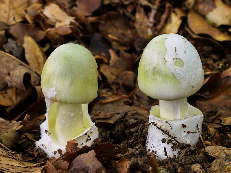 Zwei junge Fruchtkörper des Grünen Knollenblätterpilzes