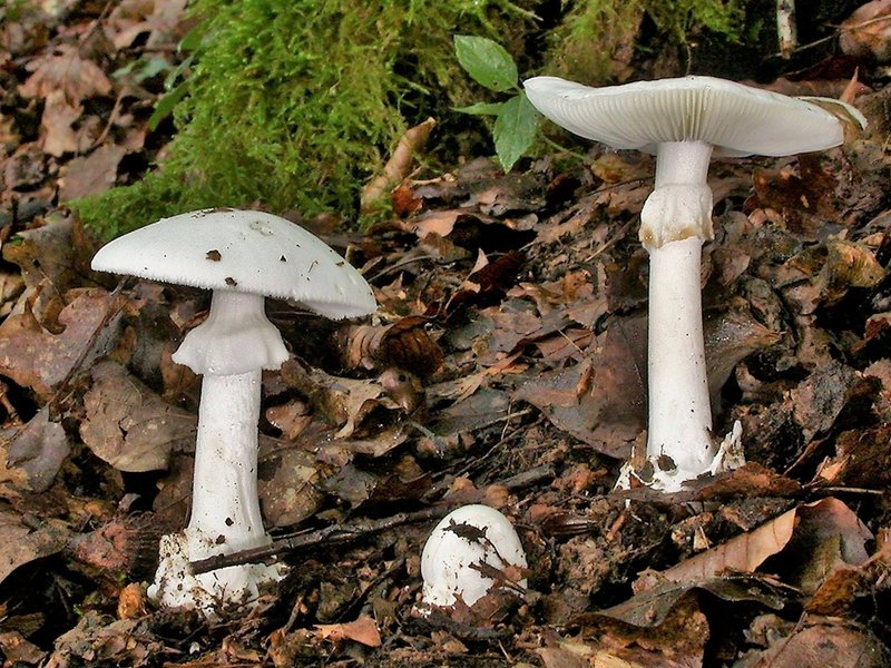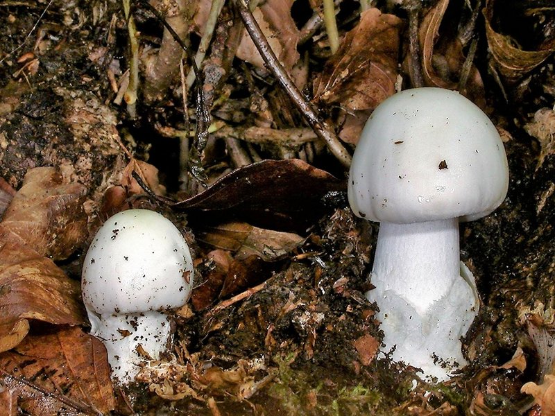 Zwei junge Fruchtkörper der weißen Varietät des Grünen Knollenblätterpilzes