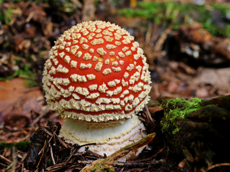 Typisch sind die Warzengürtel an der knolligen Stielbasis des Fliegenpilzes.