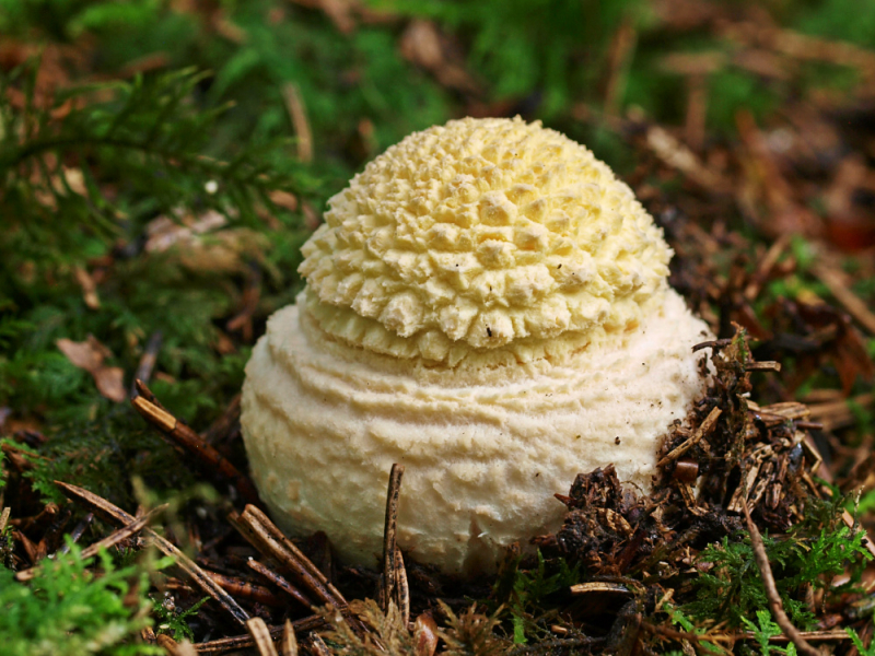 Junges, knubbeliges Exemplar eines Fliegenpilzes, das noch von der Gesamthülle umschlossen ist.